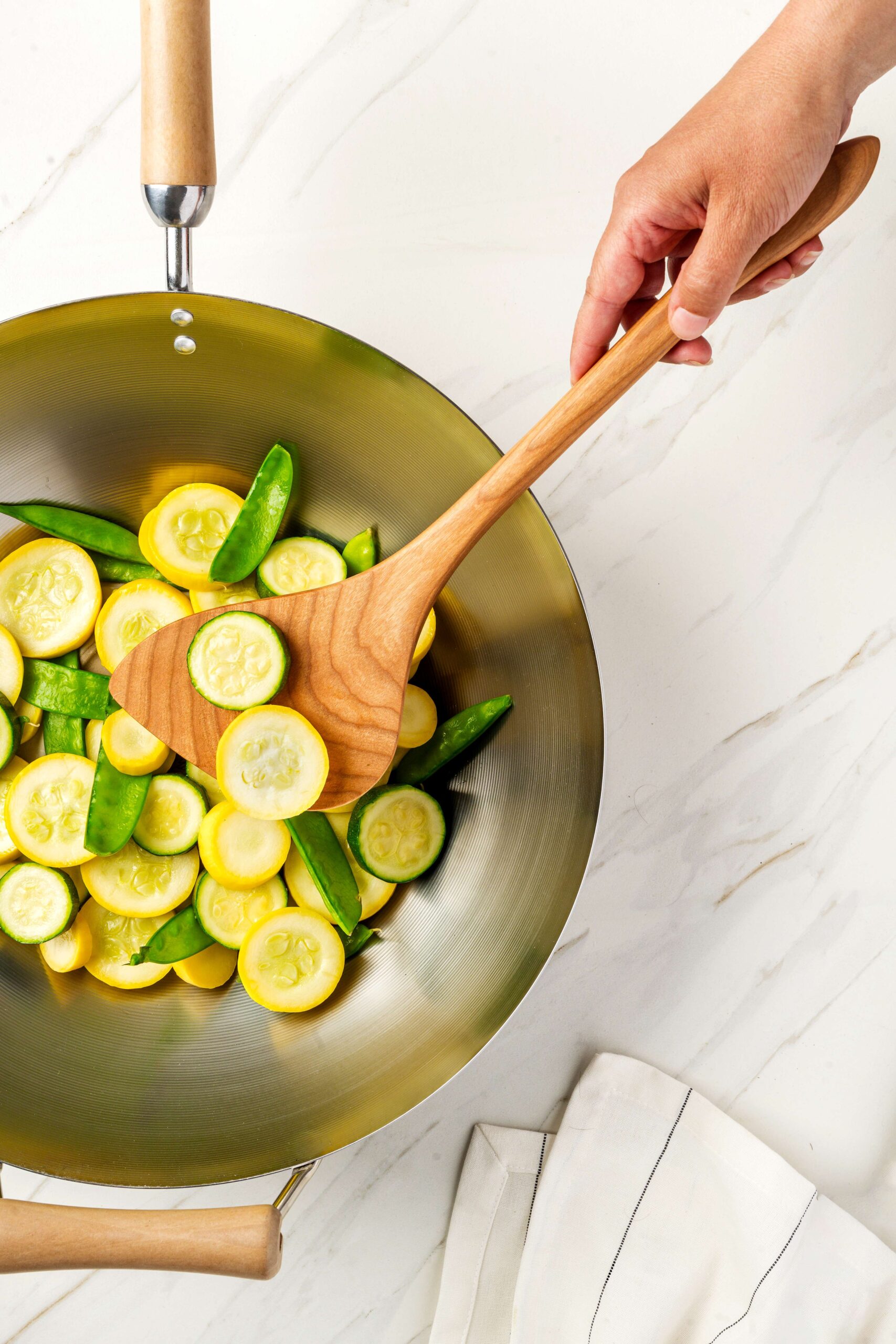 Long handled stir-frying utensil that keeps one far from the spattering oil.